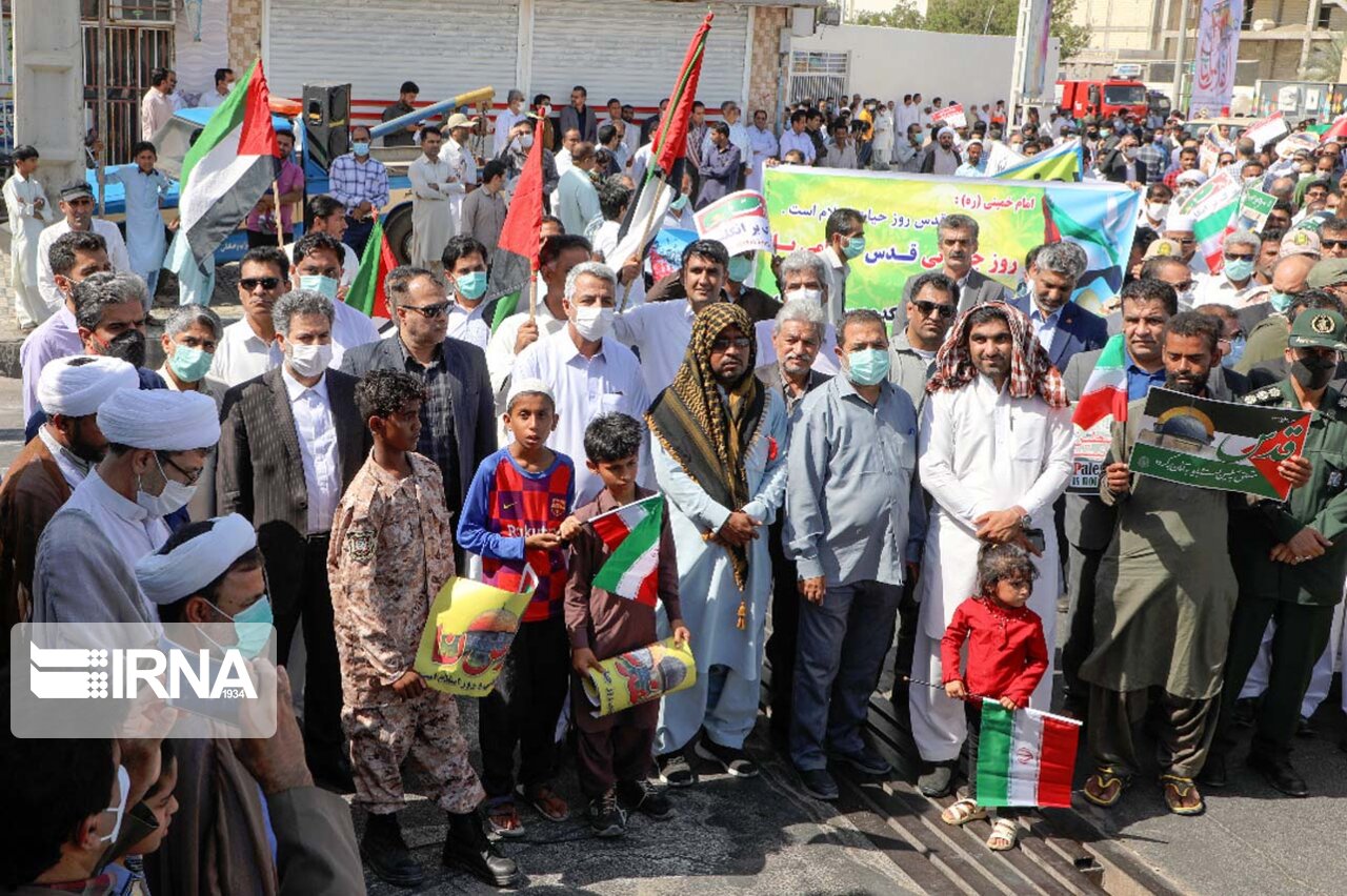 به گزارش ایرنا خروش تکبیرهای نوجوانان و همدلی کهنسالان و همزبانی جوانان شیعه و سنی سیستان و بلوچستان حماسه ای دیگر آفرید، شهروندان این استان از سواحل مکران تا پهن دشت هامون با در دست داشتن شعار نوشته‌هایی با مضمون «فلسطین پاره تن اسلام است، قدس روز همبستگی با مردم مظلوم فلسطین» و «حمایت از قدس شریف بر تمام مسلمانان لازم است» یکپارچه حمایت خود را از ملت مظلوم فلسطین فریاد زدند.